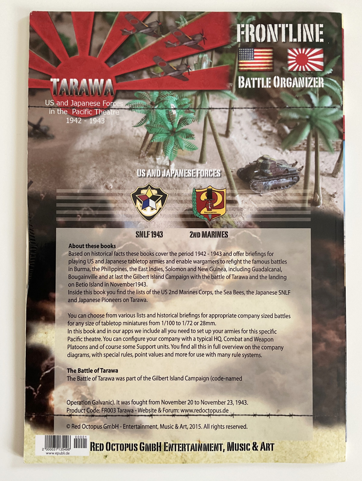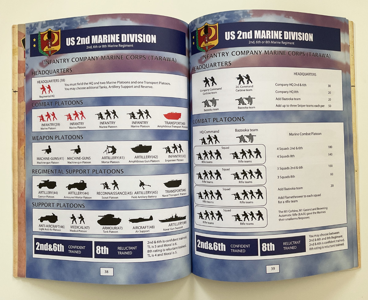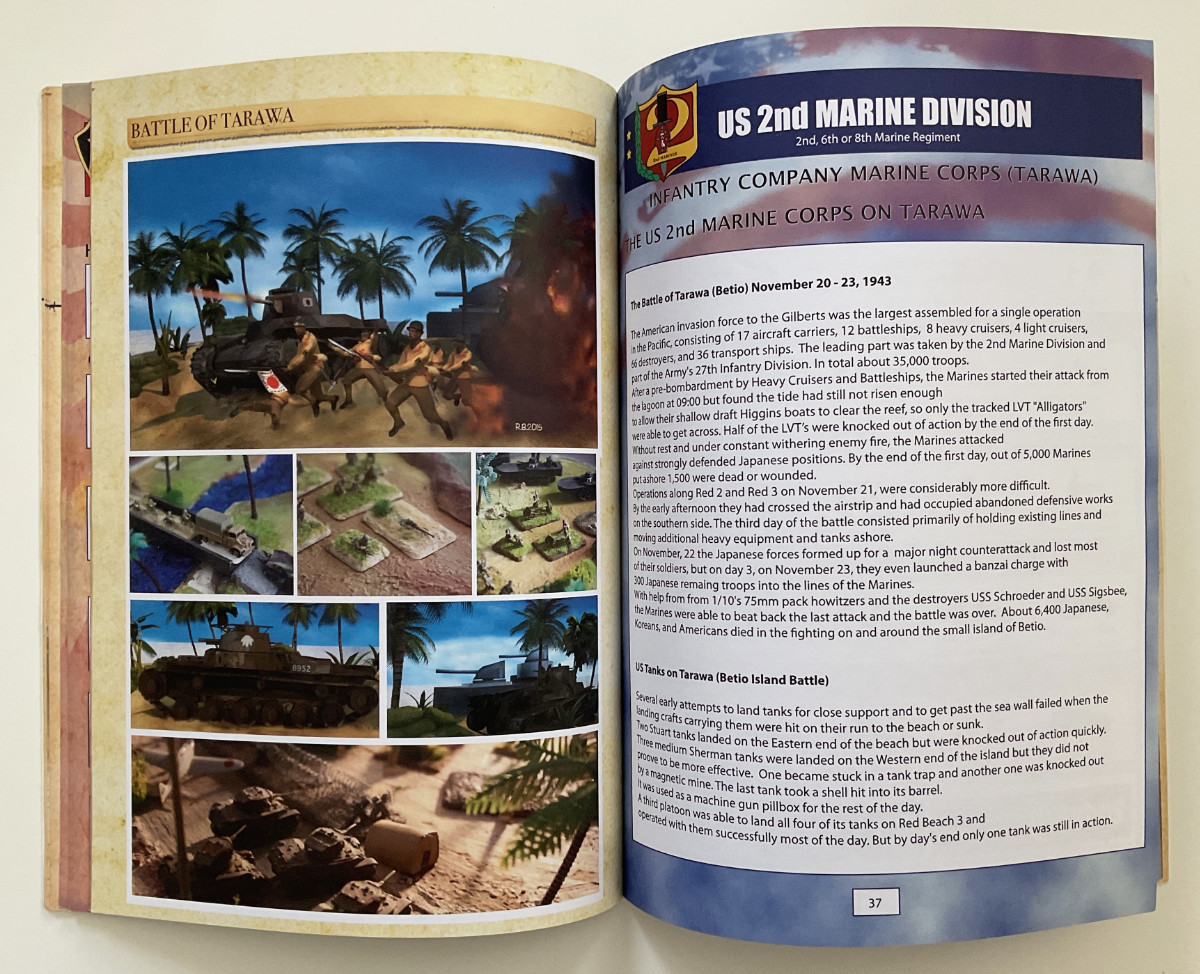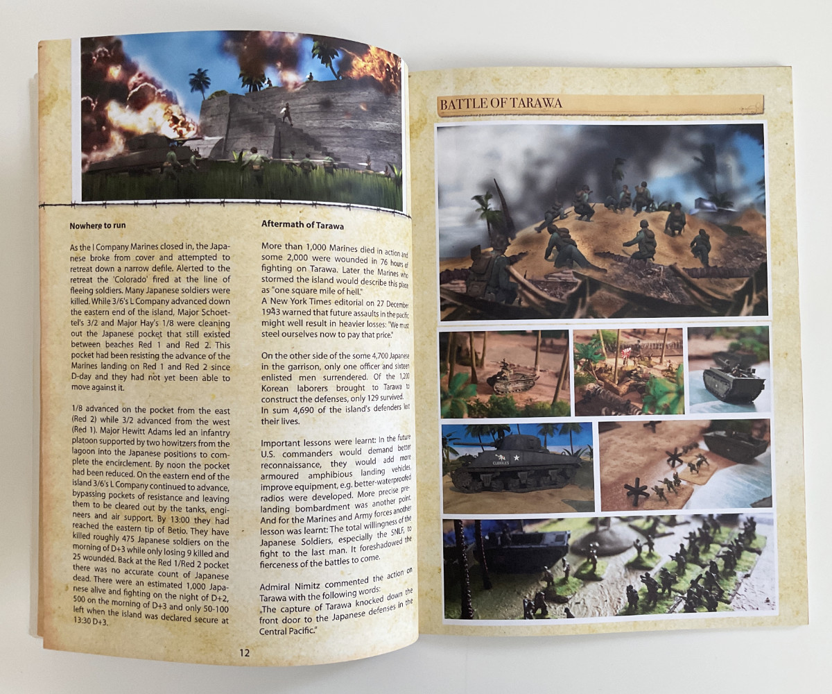 62 pages, PDF in good quality and in full colour. Contains 2 US lists and 2 Japanese lists, special rules for the armies, a story part about the setting and the historical battle of Tarawa in November 1943 between the US and the Japanese forces. (62 page full colour book).